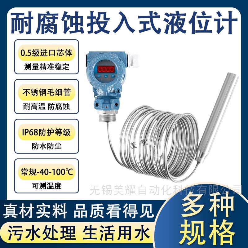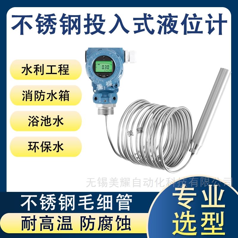 投入式液位計基于所測液體靜壓與該液體的高度成比例的原理,采用*的隔離型擴散硅敏感元件或陶瓷電容壓力敏感傳感器制作而成,將靜壓轉換為電信號,再經(jīng)過溫度補償和線性修正,轉化成標準電信號(一般為4~20mA/1~5VDC)的一種測量液位的壓力傳感器,又可以稱之為“靜壓液位計、液位變送器、液位傳感器、水位傳感器“。投入式液位計消防水箱水庫污水處理水位計